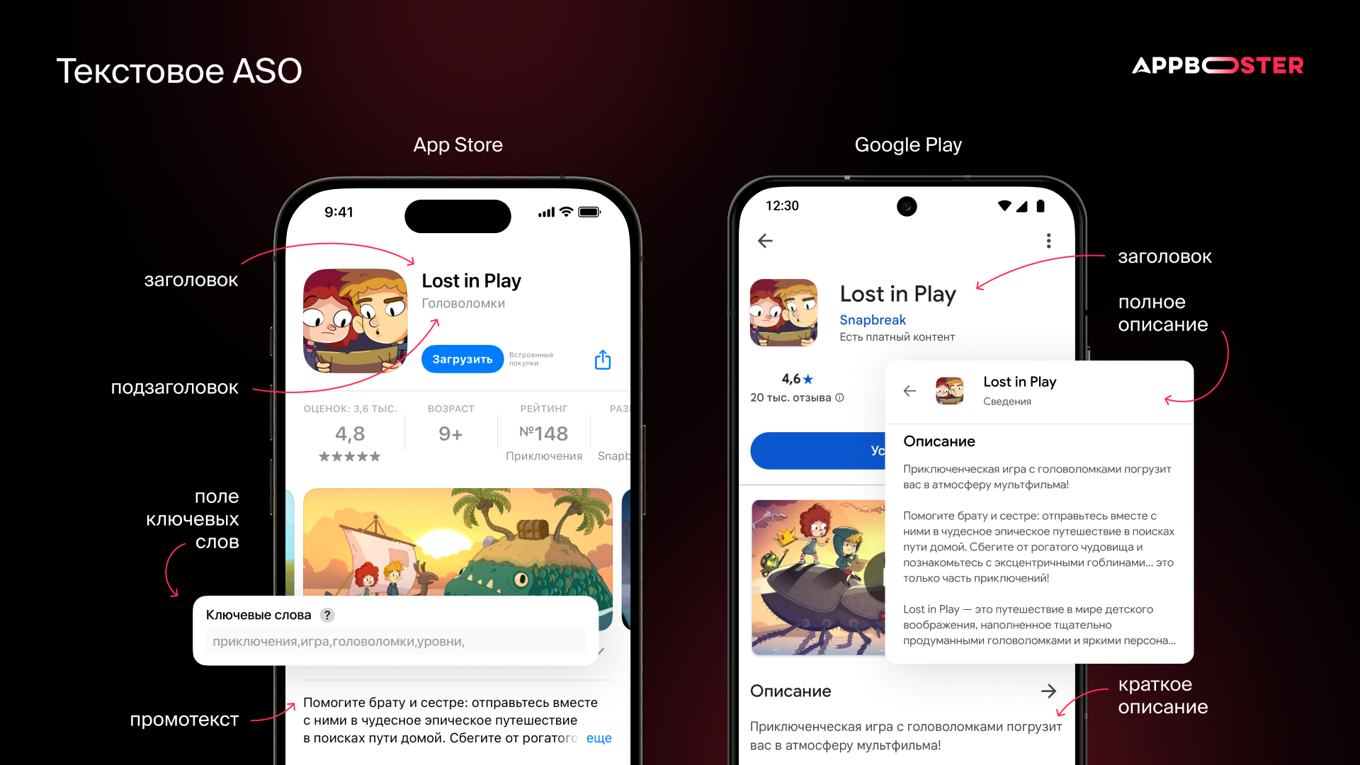 В App Store из текстовых метаданных пользователи видят заголовок, подзаголовок и промотекст, если он добавлен. Если промотекста нет — отображается начало описания. Поле ключевых слов (Keywords) заполняется отдельно, оно скрыто от пользователя. Из всех этих полей индексируются заголовок, подзаголовок и ключевые слова — промотекст и описание на индексацию не влияют.