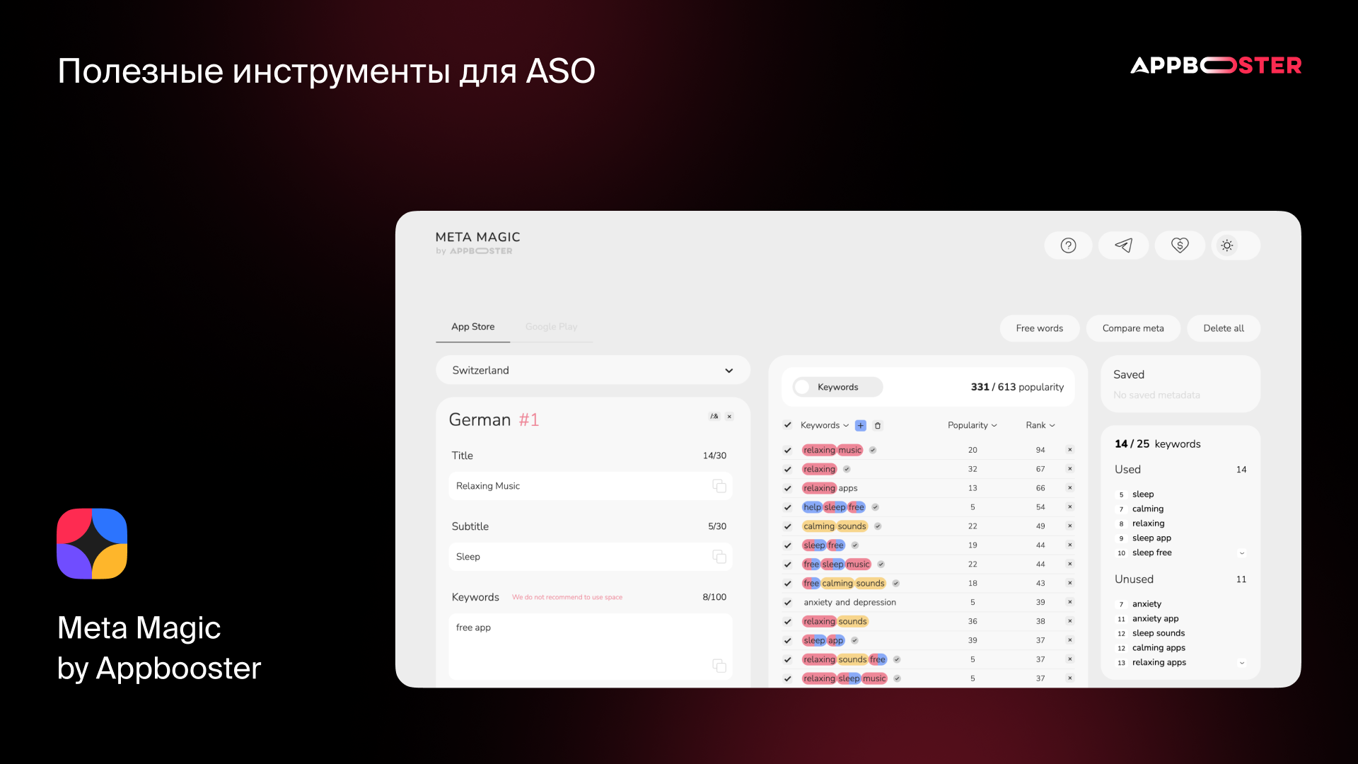 При составлении метаданных можно пользоваться простым и бесплатным сервисом MetaMagic. Изначально мы разработали его в Appbooster, чтобы упростить самим себе ежедневные задачи, а потом решили поделиться с комьюнити и сделали доступным для всех.
