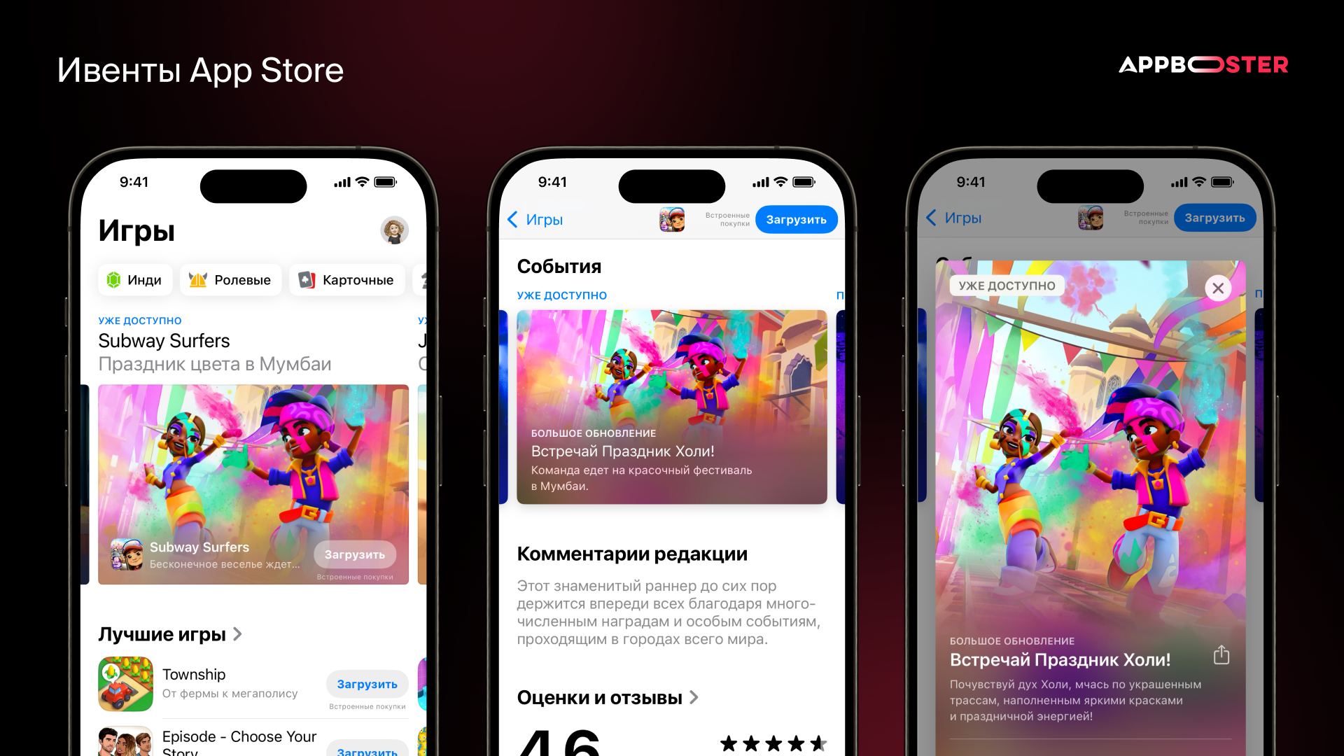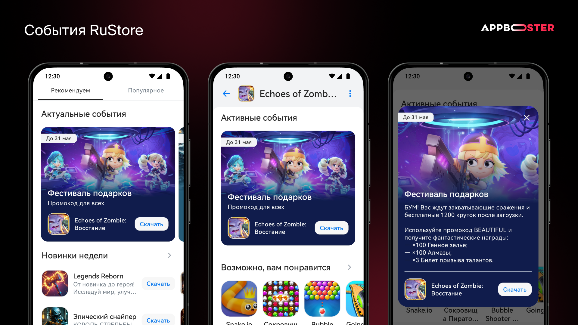 Ивенты, или события, — относительно новый инструмент продвижения в сторе. Они состоят из статичных или анимированных баннеров и текста, описывающего событие в приложении. Это может быть релиз нового персонажа или уровня, внутриигровой ивент, ограниченное предложение. События помогают привлечь новых пользователей или вернуть тех, кто давно не заходил в игру.