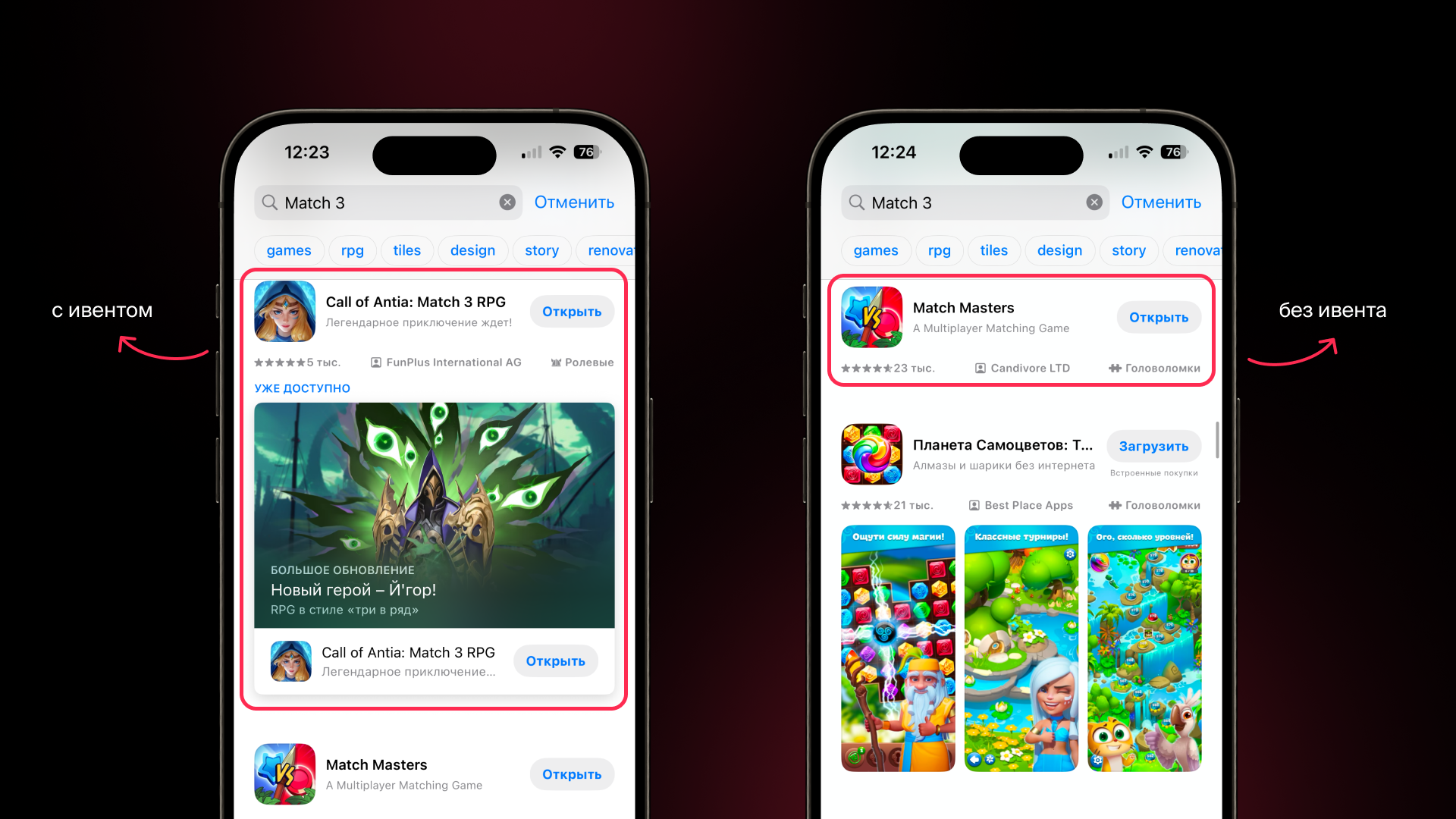 У ивентов есть ещё один плюс. В поиске App Store они показываются пользователям, которые уже скачали игру. Это помогает оставаться на виду и смещать конкурентов с первого экрана выдачи. Без ивента игрок увидел бы только иконку, тогда как другие, неустановленные приложения выделяются скриншотами.