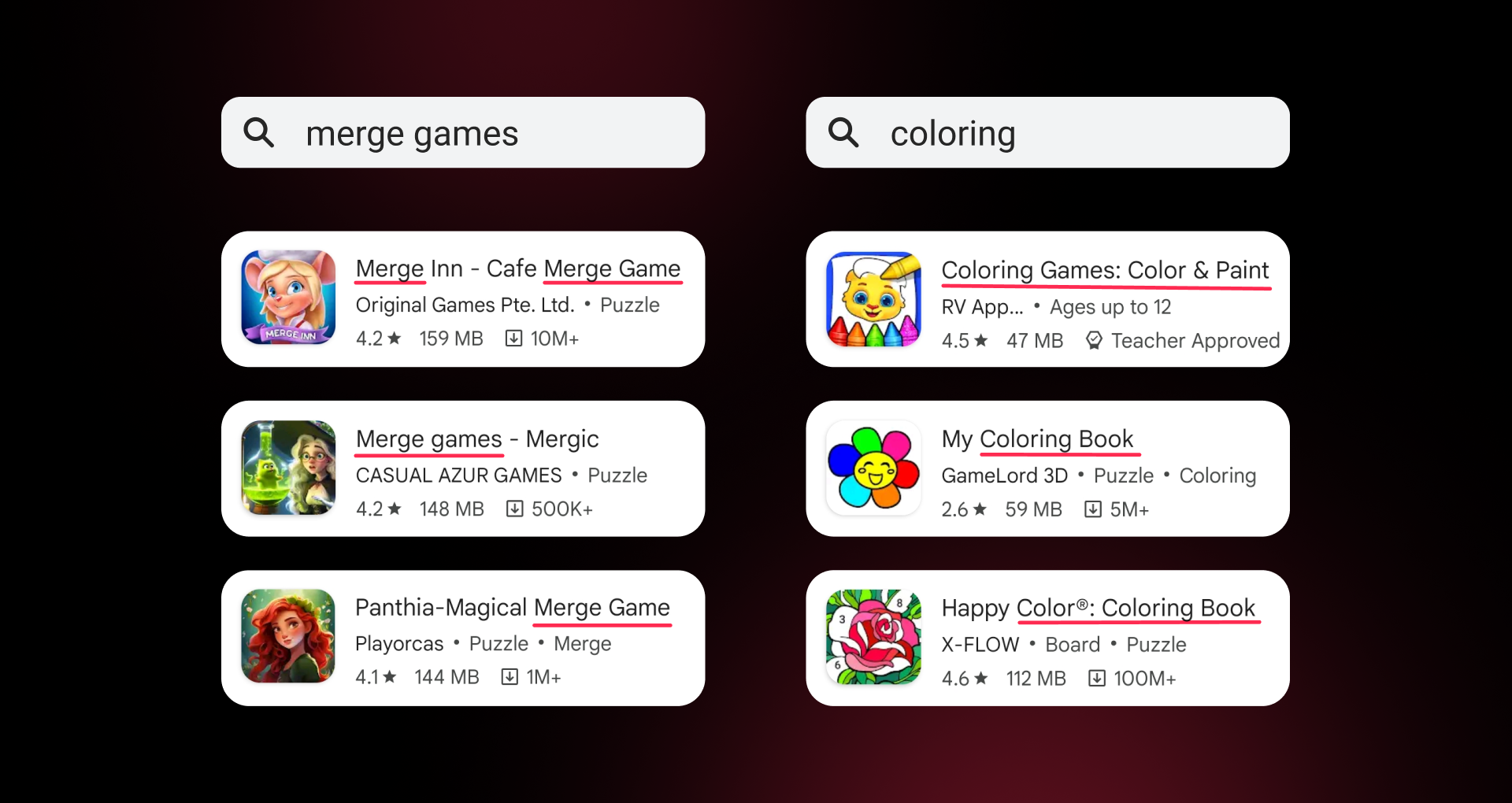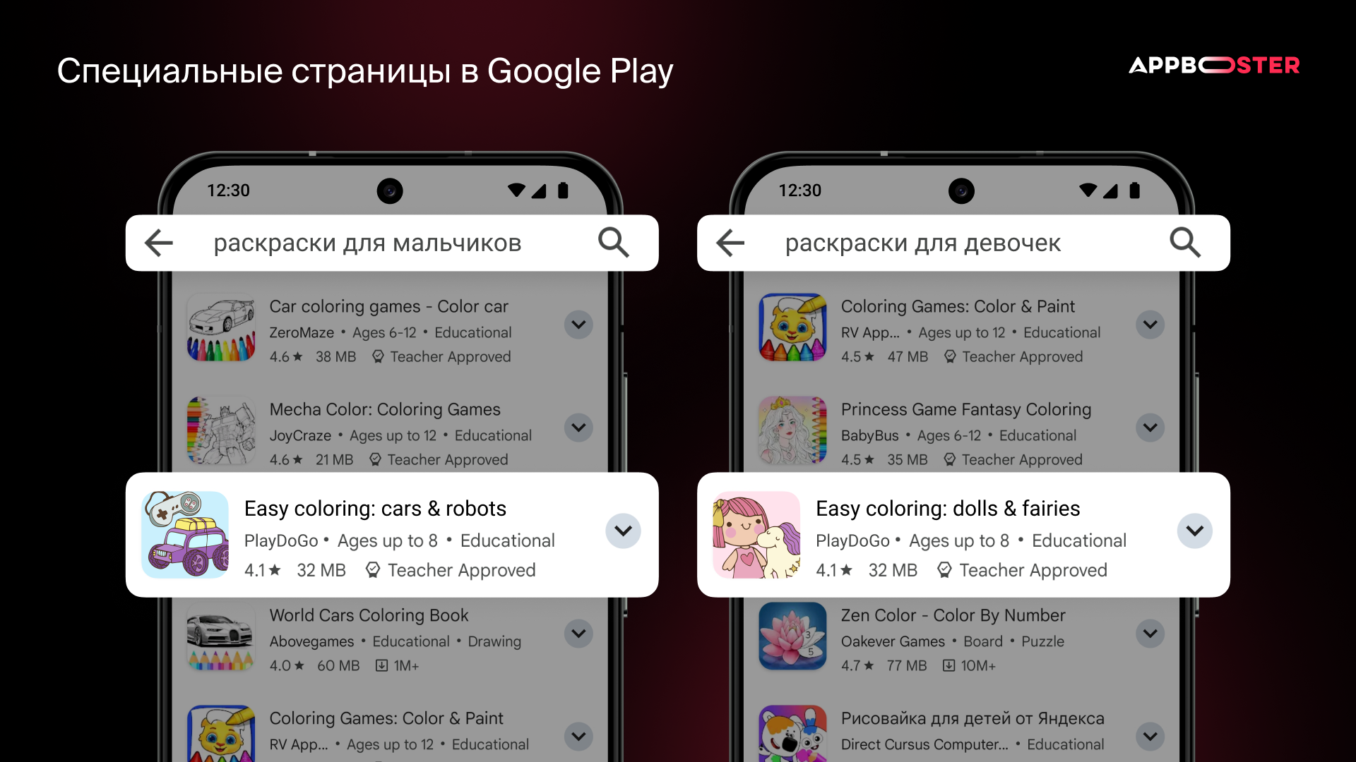 Недавно в основных сторах появилась возможность кастомизировать страницу игры под поисковые запросы. Суть в том, чтобы пользователь увидел ту версию страницы, которая с большей вероятностью его заинтересует. Например, для запроса «раскраски для девочек» можно добавить на страницу визуалы с куклами, а для «раскрасок для мальчиков» — с машинками.