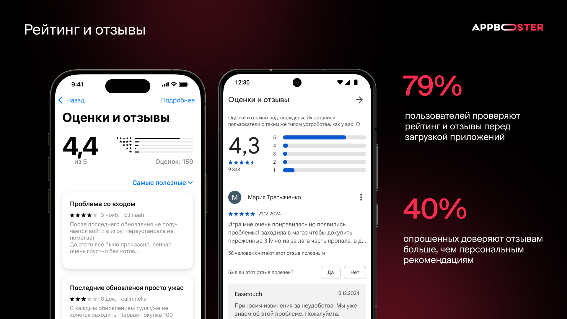 Отзывы и рейтинг напрямую влияют на то, как пользователи воспринимают игру. Ответы на комментарии и работа с критикой помогают улучшить продукт и повышают доверие к нему. Так же, как на маркетплейсах или в сервисах бронирования: никто не покупает товар с низкими оценками и не выбирает отель с плохими отзывами.