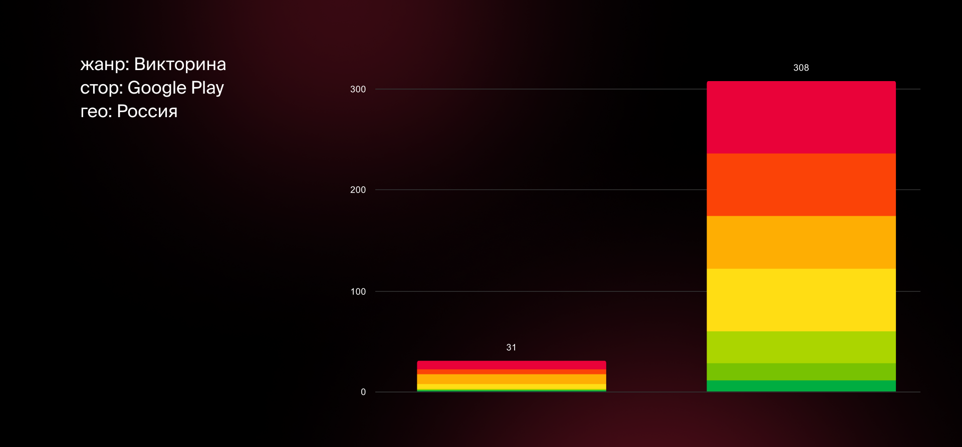Эти подходы мы с командой использовали при оптимизации игры в жанре викторины. До этого в полном описании почти не было ключевых слов и их повторов, а в кратком — использовано всего 50 символов из 80. После переработки ASO индексация выросла в 10 раз, многие запросы вышли в топ-30, и это привело к заметному росту установок, который клиент увидел в консоли.