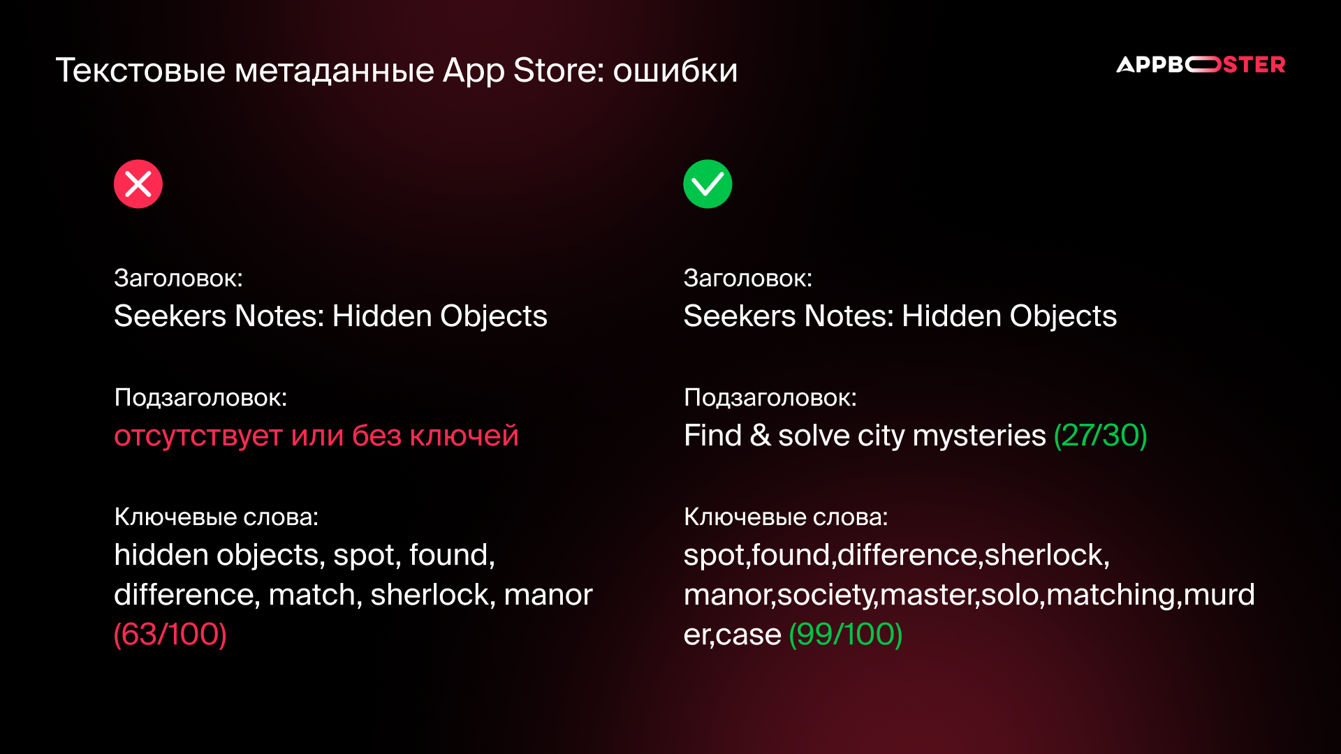 В App Store ситуация несколько другая: здесь нет длинных индексируемых описаний, а повтор ключевых слов не помогает. Более того — может навредить, если расположить один тот же ключ в разных по весу полях. Алгоритм не поймет, откуда брать ключевое слово: из более сильного заголовка или менее сильного поля Keywords? В результате игра может получить менее выгодную позицию в поиске.
