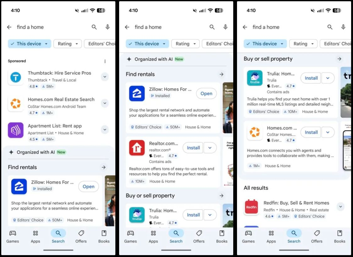 (Примечание: по состоянию на январь 2026 года в Google Play Store версии 49.3 уже есть “Ask Play experience […] that lets you talk to the Play Store like a personal assistant”, однако пока неясно, работает ли эта функция только для уже установленных приложений или также используется для поиска новых)