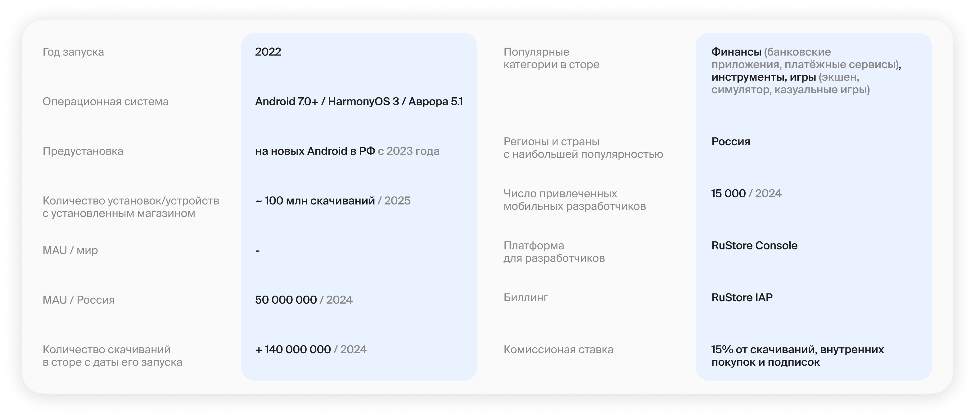 RuStore — российский магазин мобильных приложений, который разрабатывает VK при поддержке крупнейших IT-компаний и Минцифры РФ. В магазине представлены приложения разных категорий: покупки, развлечения, образование и так далее. Также есть разделы для государственных и муниципальных приложений. Кроме того, к началу 2025 года, в RuStore доступно свыше 22 000 игр. Всего, по данным сайта, RuStore предлагает более 50 000 приложений, и ~30% из них — зарубежные (преимущественно из Азии и стран СНГ).