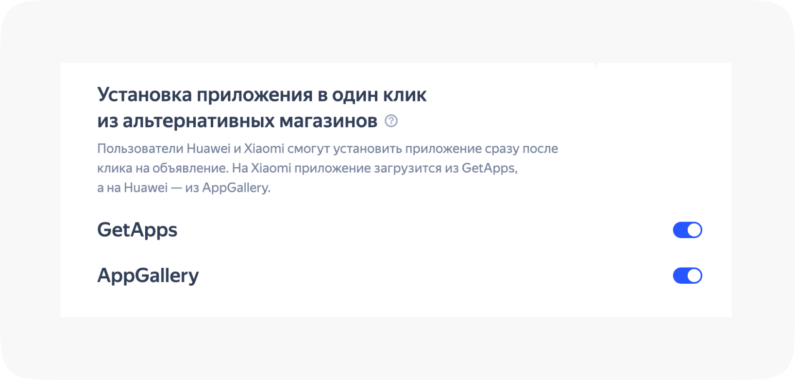 Процесс настройки мало чем отличается от рекламы приложений из Google Play, но есть несколько нюансов. Например, если хотите продвигать одно приложение на российскую аудиторию разных сторов, нужно создавать отдельные объявления и кампании. Кроме того, реклама для приложений в RuStore показывается на Android-устройствах различных брендов, а реклама для GetApps, Galaxy Store и AppGallery — только для владельцев Xiaomi, Samsung и Huawei, соответственно.