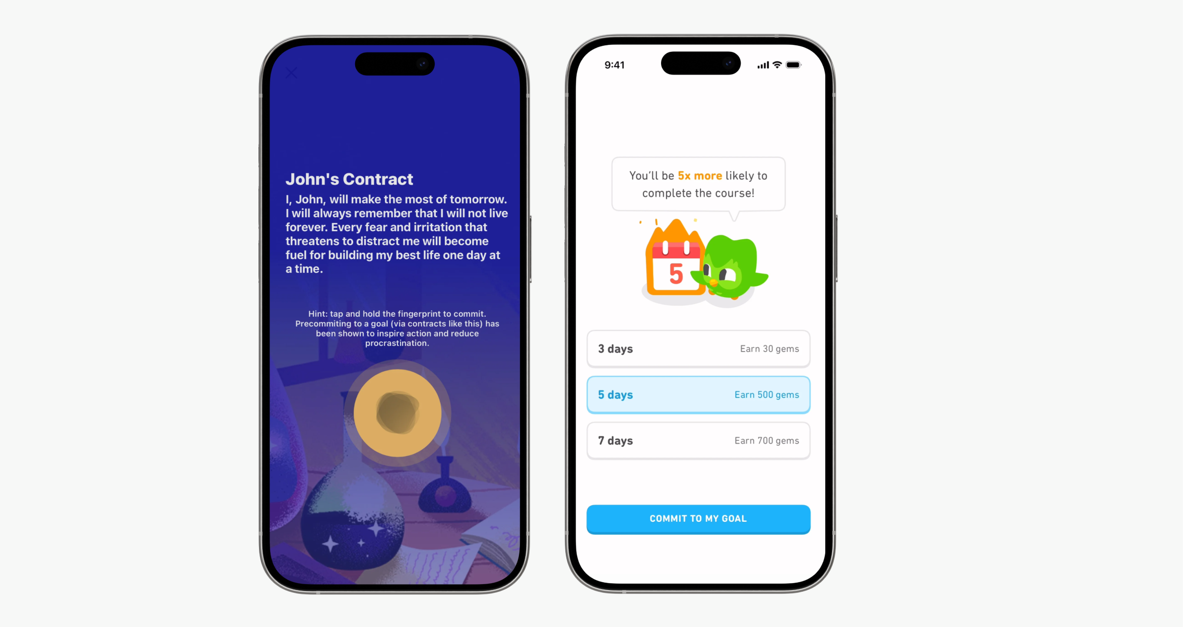 Например, Марина давно хочет заниматься спортом, но ей не хватает мотивации. Она устанавливает фитнес–приложение, которое просит ее выбрать цель. А затем показывает экран с текстом вроде: «Я обязуюсь следовать этому плану следующие 30 дней», и предлагает нажать кнопку «Подтверждаю» или даже нарисовать свою подпись пальцем по экрану. Так у Марины возникает ощущение обязательства перед самой собой, и бросить становится сложнее.